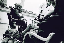 En mor med barnet på fanget, i fortrolig samtale med fastlegen, et hjemmebesøk eller en gynekologisk undersøkelse.