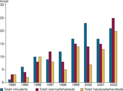 Pasientinklusjon. Det var jevn stigning av totaltallet pasienter frem til 1999, og deretter synes antallet å stabilisere seg rundt 20/år (fig 1). Myelomatose utgjør den klart største pasientgruppen, etterfulgt av lymfomer (tab 1). En tredel av pasientene gjennomgikk ikke hele behandlingen, oftest på grunn av utilfredsstillende respons eller progresjon av grunnsykdommen under forbehandlingen.