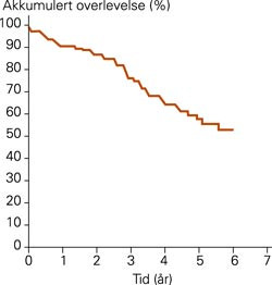 I løpet av oppfølgingsperioden er ytterligere 45 pasienter døde (tab 2). To av dødsfallene hadde relasjon til den endovaskulære behandlingen. I ett tilfelle hadde protesebeinet glidd fra hovedprotesen. Pasienten ble forsøkt operert åpent på lokalsykehuset, men døde i forbindelse med inngrepet. I ettertid mener vi det hadde vært mulig å behandle denne komplikasjonen med endovaskulær teknikk. Videre ble en 76 år gammel mann innlagt med en dekket ruptur etter at det hadde forekommet lekkasje svarende til distale feste for høyre protesebein. Dette ble reparert i lokalanestesi i forbindelse med diagnostisk angiografi, men han døde av hjerteinfarkt. Akkumulert overlevelse i hele materialet er vist i figur 1. Femårsoverlevelsen var ca. 60 %.