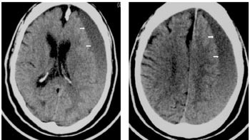 Pasienten ble overflyttet til regionsykehus, der det neste dag ble foretatt evakuering av kronisk subduralt hematom. Det ble anlagt to borehull, og i begge tømte det seg væske under høyt trykk. Forløpet var ukomplisert, pasienten var oppegående og kjekk og ble utskrevet til hjemmet fem døgn postoperativt med beskjed om ikke å ta acetylsalisylsyre de neste to ukene. Ti døgn senere (15 døgn postoperativt) ble han reinnlagt. Han klaget igjen over at høyre hånd ikke lystret ham, og fastlegen mente dessuten at han var mentalt tregere enn vanlig. Komparentopplysninger fra hans samboer indikerte at han hadde vært betydelig bedre kort etter operasjonen, men så var blitt dårligere. Ved undersøkelsen kunne man få inntrykk av en noe redusert nærhukommelse. Han lette etter ordene, og det var tydelig temporeduksjon i høyre sides arm og bein samt klossethet for finere fingerbevegelser på høyre side. Videre ble det bemerket lett redusert sensibilitet og noe livligere dype senereflekser på høyre side. Ny cerebral CT-undersøkelse (fig 2) viste en venstresidig subdural effusjon av nærmest uendret størrelse, men det var nå oppstått ulik røntgentetthet (sjiktning) i væsken som uttrykk for mulig reblødning.