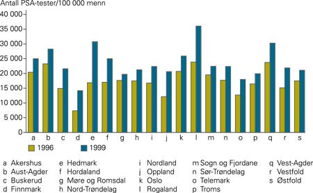 Fra 1996 til 1999 økte antall PSA-analyser i Norge fra 168 000 til 247 000, en økning på 47 %. Denne økning ble observert i alle landets fylker, men med betydelig variasjon (fig 1). Aust-Agder, Oslo, Rogaland og Vest-Agder hadde testrater signifikant over landsgjennomsnittet både i 1996 og 1999, mens Telemark og Finmark hadde testrater signifikant under landsgjennomsnittet. Fylkesvise testrater i 1999 viste høy korrelasjon med insidens av prostatakreft i 1999 i hvert fylke (Pearsons korrelasjon r = 0,730, p = 0,000, N = 19).