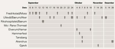 Antall pasienter innlagt pga. metanolforgiftning høsten 2002 fordelt på sykehus og måned