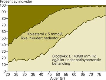 Forholdsvis enkelt kan man synliggjøre de samfunnsmedisinske konsekvensene av slike retningslinjer ved å anvende risikogrensene på en hel befolkning. I desemberutgaven av Scandinavian Journal of Primary Health Care presenterer Linn Getz og medarbeidere en slik analyse (4), utført med data fra Helseundersøkelsen i Nord-Trøndelag (HUNT 2). Andelen av hvert årstrinn som etter retningslinjene ville komme i gruppen med «forhøyet risiko» – i denne nær verdens friskeste befolkning – er meget høy om man bare legger blodtrykksverdier til grunn. Men om man også anvender de nye lave grensene for kolesterolverdier (3), vil halvparten av befolkningen bli ansett som «risikanter» allerede ved 24 års alder. Ved 49 års alder er denne andelen steget til 90 %. Så mye som 76 % av den voksne befolkning vil bli ansett for å ha forhøyet risiko (4). I en viss forstand må dette bety at en overveldende majoritet av den norske befolkning anses som unormale dersom risiko- og sykdomsbegrepet skal anvendes med noen rimelig mening.