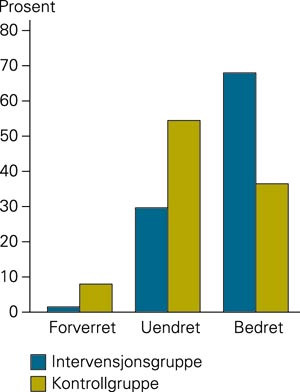 I intervensjonsgruppen er 69 % bedret mot 37 % blant kontrollpersonene, og det er færre kursdeltakere enn kontrollpersoner som er uendret eller forverret (p = 0,001). Det var omtrent samme effekt av programmet hos menn og kvinner. Blant menn er andelen bedret blant kursdeltakere og kontrollpersoner henholdsvis 63 % og 29 %, mens de tilsvarende tall for kvinner er 71 % og 40 %.