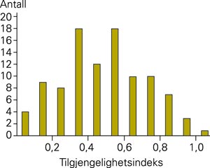 Den gjennomsnittlige tilgjengelighetsindeksen var 0,49 (95 % konfidensintervall 0,45 – 0,54, median 0,50, minimum 0,03 og maksimum 1,05). Fordelingen er også vist som et histogram i figur 1. Det var ingen signifikant korrelasjon mellom tilgjengelighetsindeksen og kommunestørrelse, listelengde, antall kurative legedager eller ventetid på ordinær time. Tilgjengelighetsindeksen var også uavhengig av om legekontoret hadde alternative kontaktmuligheter (eget nummer for øyblikkelig hjelp, hemmelig telefonnummer, faks eller e-post).
