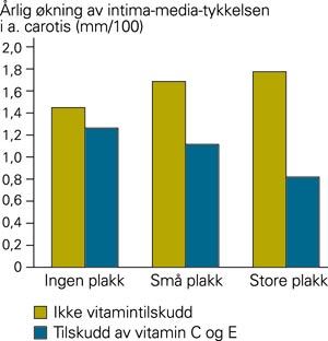 Kombinasjon av vitamin C 500 mg/dag og vitamin E (d-α-tokoferol) 272 IE/dag hemmet i løpet av tre år progredieringen av intima-media-tykkelsen i a. carotis hos menn (19). Deltakerne i studien var friske individer i alderen 45 – 69 år. Intima-media-tykkelsen økte i gjennomsnitt 0,020 mm per år hos menn randomisert til placebo, mens den hos menn behandlet med vitaminer var 0,011 mm per år (p = 0,008). Effekten var størst hos røykende menn hvor økningen av intima-media-tykkelsen i forhold til placebo var 64 % lavere; hos ikke-røykende menn var økningen 30 % lavere. Sammenliknet med placebo hadde en høyere andel av de vitaminbehandlede ingen progrediering av intima-media-tykkelsen (74 %, oddsratio 0,26) (tab 1). Vitamin C og E gitt hver for seg hadde ingen signifikante effekter på progrediering av intima-media-tykkelsen selv om det var en trend i retning av mindre økning (tab 1). Hos kvinner var utviklingen av tykkelsen den samme i behandlings- og i placebogruppen (tab 1). Etter ytterligere tre års observasjonstid var de positive funnene hos menn de samme, og størst effekt ble funnet hos individer med store plakk i a. carotis (fig 1) (20).