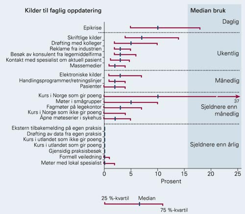 Legene oppgav at epikriser var en viktig kilde til faglig oppdatering. De ble brukt daglig av over 75 % av legene, og utgjorde i median 10 % av den totale tidsbruken på faglig oppdatering. Kurs i Norge som gav poeng til videre- og etterutdanning ble ikke brukt så ofte, men de var tidkrevende når de ble benyttet, slik at også de utgjorde 10 % av tiden benyttet til faglig oppdatering