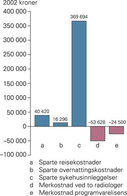 Det er imidlertid metodemessige forskjeller mellom vår undersøkelse og andres. I denne undersøkelsen har vi forutsatt at kapitalutstyr som PC og CT-maskiner samt nettverkstilkobling eksisterer ved dagens sykehus. I tillegg forutsetter vi at dette utstyret har ledig kapasitet og at avskrivingskostnaden er lik ved alle sykehus. Vi har inkludert kostnadsbesparelse som følge av mulighet for å overføre pasienter fra St. Olavs Hospital til poliklinisk oppfølging ved pasientens lokalsykehus. Årsaken til at andre har utelatt dette momentet, er nok at sykehusinnleggelser ikke har vært aktuelt å ta med i betraktning. Men i vår kostnadsberegning blir verdien av unngåtte sykehusinnleggelser relevant. Felles for denne og andre undersøkelser (8), er at de betrakter konsultasjoner ved hjelp av teleradiologi som kvalitativt likeverdige med en direkte konsultasjon. Det er en alternativ organisering av tjenestetilbudet som vurderes.