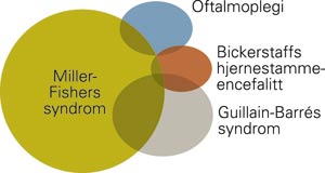 Hvis pasientene har den klassiske triade, men mer uttalt parese, dvs. kraft ≤ 4, er det sannsynlig at sykdommen er overlappende med Guillain-Barrés syndrom. Dersom pasientene bare har øyemuskelparese, kaller man syndromet akutt oftalmoplegi. Pasienter med oftalmoplegi, ataksi og redusert bevissthet eller pyramidebanefunn kan ha Bickerstaffs hjernestammeencefalitt (fig 1). Felles for Miller-Fishers syndrom, akutt oftalmoplegi og Bickerstaffs hjernestammeencefalitt er at syndromene ofte kommer etter en infeksjon, at det foreligger såkalt albuminocytologisk dissosiasjon, dvs. forhøyet konsentrasjon av spinalprotein og normalt celletall, samt GQ1b-IgG-antistoffer i serum (6). Ingen av våre to pasienter hadde redusert bevissthet eller pyramidebaneutfall som kunne gi mistanke om Bickerstaffs hjernestammeencefalitt.