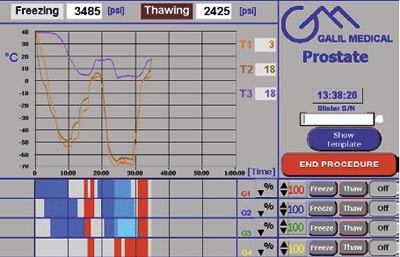 Frysingen kontrolleres med ultrasonografi. Man kan se at det dannes isballer rundt nåletuppene, isballer som etter hvert konfluerer. Isens ekspansjon mot rectum følges med spesiell oppmerksomhet (fig 4). Ved behov kan rectumveggen varmes med varmenålene, eventuelt med varmt vann som sprøytes inn via en sonde (3). Hvert område i prostata fryses i ti minutter. Frysesonen rundt nålene er 2,7 cm lang. For å fryse hele kjertelen må det som regel gjøres «pull back», der nålene trekkes tilbake i passende avstand for å fryse apikale del av prostata. Inngrepet varer omtrent to timer. Det gis antibiotikaprofylakse. Pasientene er som regel på beina og får mat samme kveld.