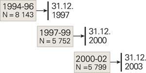 Forekomst av senere positive prøver ble analysert blant kvinner under 40 år med to eller flere prøver, inklusjonsperiode 1990 – 2002 (n = 25 483). De ble fulgt opp fra første prøve og frem til første positive eller siste negative prøve innen 31. desember året etter tidsperioden.