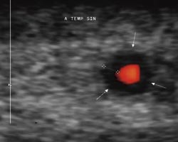 In recent literature, colour Doppler sonography is described as a new, non-invasive diagnostic tool for temporal arteritis with reported high diagnostic accuracy. The periluminal halo is assumed to represent infiltration and oedema in the arterial wall. Sonography may become a valuable contribution in the diagnostic work-up of patients with non-specific symptoms, and in others patients for guiding the surgical biopsy to an optimal site. It might also be possible to avoid surgical biopsy in selected patients with typical sonographic findings.