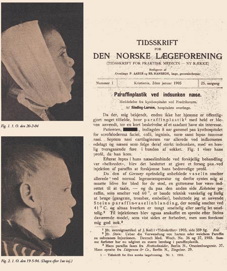 Tidligere i Tidsskriftet Parafinplastikk () sporsmal_grey_rgb Artikkel Tuberkulose var et større folkehelseproblem i 1905 enn nå. Også den gang ble det utført plastisk kirurgi. I Tidsskriftet nr. 1/1905 side 1 – 4 beretter overlege Christian Magnus Falsen Sinding-Larsen ved kysthospitalet ved Fredriksvern om en pasient med scrofuloderma faciei som fikk en penere nese ved hjelp av parafinplastikk. Kommentarer ( 0 ) Dette kommentarfeltet modereres, men kommentarer blir ikke redaksjonelt behandlet ut over å sikre at de følger retningslinjer for vårt kommentarfelt. Denne artikkelen ble publisert for mer enn 12 måneder siden, og vi har derfor stengt for nye kommentarer. Publisert: 2. juni 2005 Utgave 11, 2. juni 2005 Tidsskr Nor Lægeforen 2. juni 2005 125 : 1610-1 Publisert: 2. juni 2005 Utgave 11, 2. juni 2005 Tidsskr Nor Lægeforen 2005 125 : 1610-1 PDF Får du ikke vist PDF-filen eller vil lagre filen, kan du høyreklikke på PDF-ikonet. Velg «Lagre mål/fil som..» og hent så opp PDF-filen i for eksempel Acrobat Reader. Skriv ut Anbefalte artikler