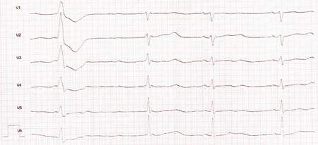 Pasient 2. 29 år gammel kvinne med tre barn. Hun hadde misbrukt opiater siden 14-årsalderen og hadde vært i metadonassistert rehabilitering i ett år. Hun brukte 150 mg metadon daglig, men ingen andre medikamenter. Pasienten synkoperte hjemme og var ifølge pårørende bevisstløs i 15 minutter. Hun hadde nærsynkoper før og etter dette anfallet. Hun kontaktet fastlegen påfølgende virkedag. Kvinnen ble innlagt i sitt lokalsykehus og overført derfra til Sykehuset Telemark på grunn av mistanke om kardiomyopati. Hun klaget ved innkomst over hjertebank og svimmelhet. Den kliniske undersøkelsen var normal. Blodtrykket ble målt til 94/60 mm Hg og pulsen var 60 uregelmessig. Serum-kaliumkonsentrasjonen var 3,9. Ved EKG-undersøkelse hadde hun rikelig med ekstrasystoler (fig 3). Nytt EKG tatt noe senere viste tydelig forlenget QT-tid (fig 4). Metadon ble mistenkt som årsak til forlenget QT-tid, og dosen ble derfor trappet ned og metadon erstattet med buprenorfin. QT-tiden ble stadig kortere (fig 5), og pasienten fikk mindre symptomer. Ved senere kontroller har pasienten vært uten symptomer og med normale EKG og langtidsregistreringer av EKG (holterregistreringer).