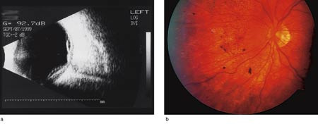 Pasient 1. En 29 år gammel tidligere frisk mann, opprinnelig fra Colombia, ble innlagt i september 1999 grunnet synsreduksjon ledsaget av hodepine i en uke. Begge øyne var injiserte, med presipitater på corneas bakflate samt moderat korpuskulær lysvei i forkammeret og i corpus vitreum. Det ble også påvist papillødem, koroidal effusjon og subretinalvæske. Visus var 0,16 på høyre øye og 0,125 på venstre. Fluoresceinangiografi viste multifokal hyperfluorescens, svarende til pigmentepitellaget og lekkasje subretinalt. Ultralydundersøkelse verifiserte koroidal effusjon og eksudativ netthinneløsning (fig 1a). Vanlige blodprøver var normale. Serologiske prøver gav ikke holdepunkter for tilstedeværelse av aktuell infeksjon. Waalers prøve, ANA og HLA-B27 var negative. I spinalvæsken var antall leukocytter forhøyet (182 · 10⁶/l). Cerebral MR viste væske i mellomøret, ellers var det normale funn. Røntgen thorax var normalt. Nevrolog, øre-nese-hals-lege og hudlege fant normale forhold.