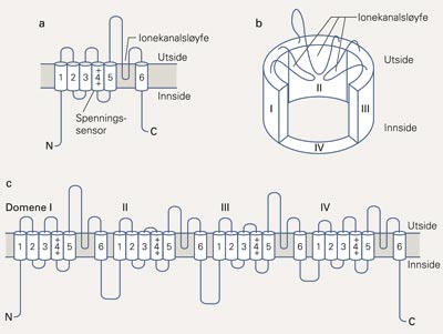 Episodisk ataksi type 2 forårsakes av forskjellige mutasjoner i CACNA1A-genet på kromosom 19p13, som koder for α1A-subenheten av en hjernespesifikk P/Q type spenningsavhengig Ca2+-ionekanal (2). Subenheten er sammensatt av fire homologe domener, hvert bestående av seks transmembrane segmenter. Disse er forbundet via ekstra- og intracellulære slynger. Slyngen imellom det femte og sjette segmentet av alle fire domener danner selve ioneporen. Figur 1C viser CACNA1A-ionekanalen. Sammensetning av aminosyrene i slyngene bestemmer kanalens ioneselektivitet. CACNA1A-genet består av 47 eksoner som særlig uttrykkes i de cerebellare purkinjecellene. Det er beskrevet missens- og nonsensmutasjoner, delesjoner, insersjoner og CAG-repetisjoner i CACNA1A. Episodisk ataksi type 2 er forårsaket av mutasjoner som gir anledning til et trunkert protein og dermed tap av funksjon. En familie med episodisk ataksi type 2 hadde en punktmutasjon i CACNA1A (18). Forskjellige punktmutasjoner i det samme gen forårsaker familiær hemiplegisk migrene 1, som er en sjelden autosomalt dominant lidelse karakterisert av migrene og forbigående lammelser og sensoriske forstyrrelser (2). Mange av familiær hemiplegisk migrene 1-familiene har også paroksystiske eller progredierende cerebellare symptomer som nystagmus og gangataksi. Økt antall CAG-repetisjoner i den C-terminale ende gir anledning til spinocerebellar ataksi type 6 (SCA6) som er en jevnt progredierende cerebellar ataksi (19). Det er beskrevet en enkelt familie med svær progredierende cerebellar ataksi med en punktmutasjon i CACNA1A-genet (20). Dette er igjen et eksempel på allelheterogenitet, hvor forskjellige mutasjoner i det samme gen kan være årsak til forskjellige sykdommer.