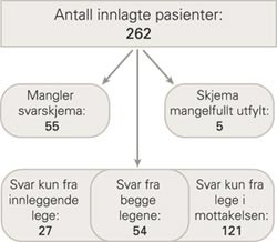 Antall øyeblikkelig hjelp-innleggelser i uke 23 omfattet 262 personer. Sykehuslegene leverte skjema for 175 pasienter (67 %) mens det tilsvarende tallet blant innleggende leger var 81 (31 %). For en gruppe på 54 pasienter (21 %) fikk vi inn skjema både fra innleggende og mottakende lege. Vi fikk inn opplysninger fra minst en av legene på 202 av 262 pasienter (77 %) (fig 1).