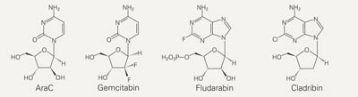 Nukleosidanaloger brukes til behandling av maligne blodsykdommer og noen krefttyper (1). Blant disse cytotoksiske molekylene finner man pyrimidinanalogene cytarabin og gemcitabin samt purinanalogene fludarabin og cladribin (fig 1). Cytarabin, eller 1-β-D-arabinofuranosylcytosin (araC), er en essensiell del av behandlingen av akutt myelogen leukemi der den brukes alene eller i kombinasjon med antrasykliner. Den eneste strukturelle forskjellen fra cytidin er arabinosen som erstatter ribosen. Gemcitabin, eller difluorodeoksycytidin, er den eneste nukleosidanalog som er aktiv på ikke-hematologiske kreftlokalisasjoner som pancreas, lunge og blære. Flere kreftlokalisasjoner studeres for tiden, som for eksempel brystkreft og visse maligne blodsykdommer. Strukturen til gemcitabin har to fluoratomer på 2’-posisjonen av sukkerdelen av molekylet. Fludarabin, eller 9-β-D-arabinosyl-2-fluoroadenin, brukes til behandling av kronisk lymfatisk B-celle leukemi og er også aktiv på lavgradig non-Hodgkins lymfom og andre lymfomtyper. På grunn av dårlig hydrofil løselighet, administreres fludarabin som den monofosforylerte formen. Cladribin, eller 2-kloro-2’-deoksyadenosin, er en annen adeninanalog som brukes til behandling av hårcelleleukemi.