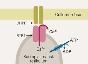 Malign hypertermi er et alvorlig hypermetabolsk syndrom grunnet patologisk muskelkontraktilitet. Muskelcellenes kontraksjon og relaksasjon styres av konsentrasjonen av kalsiumioner i cytoplasma. Utstrømning av kalsiumioner fra sarkoplasmatisk retikulum til myoplasma gir kontraksjon, tilbakestrømning av ioner gir relaksasjon. Reguleringen av kalsiumkonsentrasjonen styres av ryanodinreseptor 1 (RYR1) i sarkoplasmatisk retikulum og dihydropyridinreseptorkomplekset i muskelcellemembranen (fig 1). Mekanismen bak malign hypertermi synes å være endringer i disse reseptorene. Hos malign hypertermi-følsomme individer kan RYR1 være forlenget åpen. Dette gir en ukontrollert utstrømming av kalsiumioner til cellenes cytoplasma – og dermed en forlenget kontraksjon av den tverrstripede skjelettmuskulatur (10).