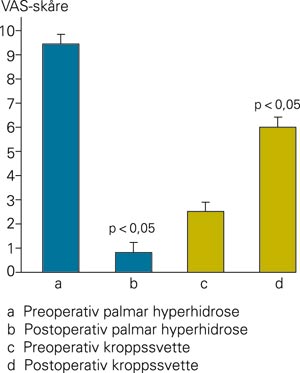 Ved palmar hyperhidrose oppnådde 27 av 28 en reduksjon i VAS-skåre på > 3. Gjennomsnittlig VAS-skåre var 9,5 ± 0,2 før og 0,8 ± 0,4 etter operasjonen (p < 0,05) (fig 1). Av 28 pasienter var 25 meget fornøyde eller fornøyde, én var mellomfornøyd og én misfornøyd, mens én angret. Den ene som angret, angav forverring på alle spørsmål. Ingen rapporterte om residiv.