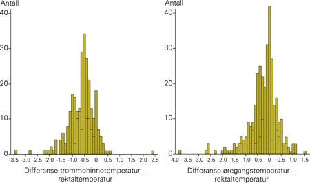 Trommehinnemålingene hadde et gjennomsnittlig avvik på –0,53 °C fra rektal temperatur (p < 0,01) (fig 1). Ved å bruke gjennomsnittet av målingene i høyre og venstre øre, hadde 92 % av pasientene lavere verdier ved trommehinnemåling enn ved rektal måling.