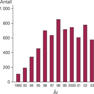 I løpet av observasjonsperioden ble det totalt rapportert 6 725 nye tilfeller av arbeidsbetinget sykdom til Petroleumstilsynet i Norge. I alt 6 475 av tilfellene (88 %) var rapportert av bedriftslege, 165 (2 %) av allmennleger og 105 (1 %) av spesialister. I tillegg var 665 av meldingene (9 %) uspesifisert når det gjaldt legens stilling. Antall tilfeller varierte noe fra år til år, med en økning fra 110 i 1992 til 580 i 2003 (fig 1). Antall rapporterte tilfeller innen det enkelte selskap viste store variasjoner fra år til år (ikke gjengitte data). Fra 1996 til 2003 var antallet meldte tilfeller relativt stabilt.