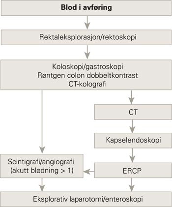 Utredning og behandling av tarmblødning følger standardiserte prinsipper og handlingsprogrammer (fig 1). Blødning fra øvre gastrointestinaltractus representerer sjelden de største diagnostiske vanskene, men behandlingen kan være utfordrende. De fleste blødninger i tykktarmen skyldes polypper, kreft, divertikler og angiodysplasier. Strategien for håndtering av pasienter med de to første diagnosene er oftest grei, mens divertikkelblødning kan by på problemer med hensyn til lokalisasjon, og angiodysplasiene kan være vanskelige å finne. Tynntarmen er blødningsfokus i 3 – 5 % av tilfellene, og disse kan iblant by på de største diagnostiske utfordringene (1, 2). Vaskulære abnormaliteter er årsak til 70 – 80 % av blødningene i tynntarmen (3). Andre årsaker er svulster, betennelser, sår og divertikler. Man må også være oppmerksom på medikamentbruk som blødningsårsak, og i en studie av NSAID-brukere fant man erosjoner eller ulcera hos 71 % av pasientene (4). «Push-enteroskopi» med 220 – 250 cm langt skop samt kapselendoskopi representerer et langt skritt videre med tanke på å visualisere blødningskilden ved tynntarmsblødning (5, 6).