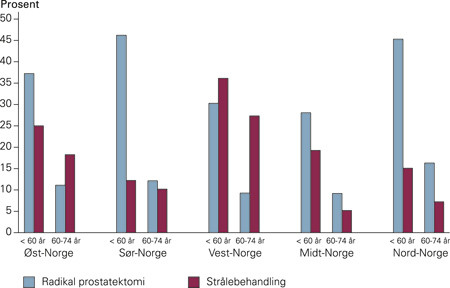 Fordelingen mellom strålebehandling og prostatektomi var avhengig av pasientens alder. På landsbasis var prostatektomi den vanligste behandlingsmåten for pasienter under 60 år, de over 60 år fikk som oftest strålebehandling. Disse tallene varierte likevel sterkt mellom regionene. I Helse Sør, Helse Midt-Norge og Helse Nord var radikal prostatektomi vanligst for begge aldersgrupper. I Helse Vest ble strålebehandling hyppigst brukt. Radikal kirurgi var mest brukt for gruppen under 60 år i Helse Øst, for gruppen 60 – 74 år var strålebehandling vanligst (fig 1).
