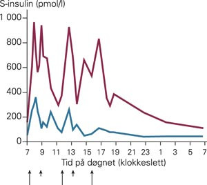 Insulinbehandling ved type 1-diabetes er substitusjonsbehandling, og den tar sikte på å gjenopprette en normal fysiologisk funksjon som er tapt (4). Behandlingen skal erstatte manglende basal insulinproduksjon og bortfall av de normale sekresjonstoppene ved måltid. Normalt stiger insulinnivået i plasma svært raskt etter et måltid, for så å falle tilbake til basalnivået igjen (fig 1).