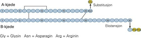 I glargininsulin (Lantus) er det gjort to endringer i den molekylære strukturen, noe som har resultert i langsom absorpsjon og lang virketid (fig 1) (4) . To argininmolekyler er lagt til i den C-terminale enden av betakjeden, hvilket endrer det isoelektriske punkt fra pH 5,4 til pH 6,7, og asparagin i posisjon A21 er byttet ut med glysin for å stabilisere molekylet i løsning. Når løsningen med glargininsulin (pH 4) injiseres subkutant (pH 7,4), presipiterer insulinet og absorberes langsomt. Det er vanskelig å angi eksakt virketid for glargininsulin, men i en studie hos friske fant man at virkningen på blodsukkernivået etter en injeksjon av 0,4 enheter/kg økte de første fire timene, for deretter å holde seg konstant i 30 timer (5) .