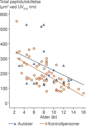 Det var ingen signifikant forskjell i utskillelse av peptider (totalt eller for enkeltpeptider) mellom gruppen med autismespekterforstyrrelser og de to kontrollgruppene (tab 2). Det kom frem en klar negativ aldersavhengighet, der verdiene falt med økende alder for totalpeptider i kontrollgruppen (R = – 0,669; p = 0,01) og for IAG i både autismespekterforstyrrelsegruppen og kontrollgruppen (hhv. R = – 0,538; p = 0,05 og R = – 0,552; p = 0,01) (fig 1, fig 2). I gruppen med autismespekterforstyrrelser var det ikke signifikant negativ korrelasjon mellom total peptidutskillelse og alder.
