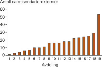 Undersøkelsen viser at det er store forskjeller i antall inngrep per sykehus og at det totale antallet generelt er lite sammenliknet med enkelte andre land (7). Det er ikke vist entydig sammenheng mellom volum og kvalitet når det gjelder carotiskirurgi (8). Fra store registerbaserte studier i USA er det påvist at resultatene blir bedre hvis kirurgene har et høyt operasjonsvolum per år i forhold til dem som har et lavt volum (9). Slike data er viktige, men kan ikke uten videre overføres til skandinaviske forhold. Av hensyn til ressursbruk og utdanning kan det være lite hensiktsmessig å utføre carotiskirurgi ved avdelinger som har mindre enn for eksempel ti inngrep per år. Sett under ett er imidlertid behandlingsresultatene på høyde med internasjonale anbefalinger, og i Norsk karkirurgisk register rapporterte man en 30 dagers kombinert frekvens av slag og død på 3,7 % ved behandling av 244 carotisstenoser i 2002 (10). 84 % av operasjonene ble utført for symptomatiske carotisstenoser. Vi har sammenliknet antall carotisendarterektomier i Norsk karkirurgisk register i treårsperioden 2000 – 02 med Norsk Pasientregister (NPR), og fant at 16 % av carotisendarterektomiene ikke var registrert i det karkirurgiske registeret. Ved å identifisere diagnosekoder for slag og kode for død i Norsk Pasientregister var det likevel godt samsvar mellom de to registrene når det gjelder prosentvis angivelse av postoperativt slag og død i sykehus for 2002 (11). Ifølge Norsk Pasientregister ble det registrert 297 endarterektomier med operasjonskode PAF20–PAF22 i Norge i 2002 (K. Rudjord, personlig meddelelse), og både Norsk karkirurgisk register og vår studie skulle være representativ for virksomheten når det gjelder carotiskirurgi i Norge.