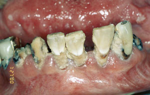 Det er velkjent at bisfosfonater er meget effektive i å redusere symptomer og komplikasjoner ved metastatisk beinsykdom hos pasienter med brystkreft, prostatakreft og multiple myelomer (20). Imidlertid er det i den senere tid rapportert osteonekrose i kjevene (avaskulær beinnekrose) som mulig komplikasjon/bivirkning i forbindelse med slik bisfosfonatterapi (21, 22). De fleste rapporterte tilfeller er assosiert med de høypotente bisfosfonatene pamidronsyre og zoledronsyre og ekstraksjon av tenner under slik behandling (fig 2). Av 36 tilfeller av osteonekrose var 28 (78 %) initiert av tannekstraksjoner (21). Av de resterende «spontane» beineksponeringene synes tynn munnslimhinne å ha betydning, da de fleste tilfellene oppstod på lingualsiden posteriort i mandibelen, et sted med tynn mucosa. Vi har hittil registrert fem tilfeller av bisfosfonatassosiert ostenekrose, alle i underkjeven, fire etter tannekstraksjoner og ett etter oralkirurgisk inngrep.
