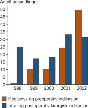 Pasientmaterialet ble kategorisert etter årsak til hjertesvikt og indikasjon for intraaortal ballongpumpe. Disse gruppene var pasienter med akutt hjerteinfarkt behandlet med perkutan koronar intervensjon (PCI) (n = 41), ventrikkelseptumruptur eller akutt mitralinsuffisiens som komplikasjon til akutt hjerteinfarkt (n = 23), ustabil angina pectoris (n = 8), alvorlig hjertesvikt og som ventet på hjertetransplantasjon (n = 10), akutt myokarditt (n = 6) og andre årsaker (to pasienter med mitralendokarditt med stor mitralinsuffisiens, en pasient med mitralventiltrombose, to pasienter med vaskulær rejeksjon i hjertetransplantat og en pasient med dilatert kardiomyopati) (n = 6). I materialet var det 68 (72 %) menn og 26 (28 %) kvinner. Gjennomsnittsalder var 59 år (standardavvik 13 år). Antall medisinske og preoperative behandlinger i perioden 1998 – 2002 sammenliknet mot ren kirurgisk indikasjon er vist i figur 1.