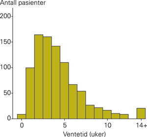 Det var stor spredning i ventetiden, og gjennomsnittet var seks dager mer enn medianen. For de få pasientene (n = 19) i stadium 4 var det noen som ventet spesielt lenge (254 og 405 dager), slik at gjennomsnittlig ventetid ble betraktelig lengre enn den mediane. Multivariable analyser identifiserte stadium 3 og 4 som forklarende for lengre ventetid. Men sett i sammenheng med få observasjoner og at median ventetid er kortere enn ved de øvrige stadier, må et slikt resultat tolkes med forsiktighet.