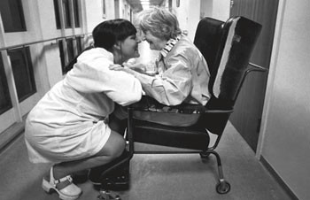 Så møter vi kvinnene i pleie- og omsorgstjenesten i bydelen (bare sykehjemslegen er mann, og han har vi fortsatt ikke møtt). Her er Linda fra hjemmesykepleien, Else fra rehabiliteringsposten på sykehjemmet, Gro som er fysioterapeut og Camilla som er fars primærsykepleier. De kaller ham Helge. De snakker til ham. De er urolige for de dårlige nyhetene de har å fortelle om hvor skrøpelig han er, i tilfelle vi skal bli lei oss. De er forsiktige i sine uttalelser – venter til vi har respondert. De foreslår hjelpetiltak på en måte som gjør at vi ikke blir fortvilet over hvor mye hjelp han trenger, men slik at tiltakene fremstår som gode løsninger. De hjelper oss til en felles forståelse. Vi kan snakke til ham med samme budskap. Det er ikke vanskelig å være enige om at det blir godt for ham og mor å få hjemmesykepleien på besøk når han kommer hjem. Han skal hjem – det glemmer han ikke. Han blir rolig og stemningen blir god. Nesten munter. «Du har vært helt konge, du far.» – Og han kan svare: «Ja, men nå er jeg blitt altfor gammal, vet du. Jeg er en olding, jeg.» For det er lov å bli gammel og trenge hjelp fra «alle disse damene». Han smiler så godt, faren min.