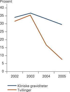 I perioden 2002 – 05 har andelen kvinner som har fått elektiv tilbakeføring av bare ett embryo ved vår avdeling steget fra 10 % til 75 % (tab 1). Forekomsten av tvillingsvangerskap etter assistert befruktning er i samme periode blitt redusert fra 36 % til 8 % (fig 1). Andelen egguthentinger med nedfrysing av overtallige embryoer har økt fra 27 % til 69 % (tab 1). Overlevelsen etter tining av embryoer har økt fra 34 % til 59 % (tab 1).