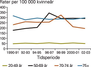Blant 70 – 74-åringene som er bosatt i Akershus, Hordaland, Oslo og Rogaland, øker forekomsten av brystkreft fra om lag 250 per 100 000 kvinneår i perioden før og rundt oppstart av Mammografiprogrammet til om lag 325 i andre screeningrunde (1998 – 99). Deretter reduseres forekomsten (fig 1). For denne aldersgruppen er forekomsten av stadium 1-svulster stabil på om lag 170 per 100 000 kvinneår før programmet. Etter screeningoppstart (1998 – 99) øker forekomsten for deretter å bli redusert (fra 211 til 148 per 100 000 kvinneår) (fig 3). Svulster i stadium 2+ forekommer hos om lag 100 per 100 000 kvinneår gjennom hele observasjonsperioden. I Agder, Telemark, Troms og Finnmark er forekomsten av brystkreft blant 70 – 74-åringene nokså stabil omkring 220 per 100 000 kvinneår, med en liten nedgang til 187 i 2002 – 03. Forekomsten av stadium 1-svulster varierer mellom 140 og 169 tilfeller per 100 000 kvinneår gjennom hele observasjonsperioden, mens av svulster i stadium 2+ er den 75 – 105 for den eldste alderskohorten (fig 4).
