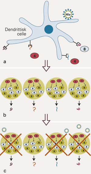 En annen variant er en peptidbasert vaksinekandidat (Vacc-4x) som er utviklet av det norske bioteknologifirmaet Bionor Immuno. Allerede i 2001 ble det gjort fase 1-utprøvninger ved Haukeland Universitetssjukehus (32). Vacc-4x består av fire hivassosierte peptider som korresponderer med konserverte områder i genomet for svært mange hivstammer. Peptidene gis intradermalt sammen med en vekstfaktor (GM-CSF) for å stimulere og modne dendrittiske celler i huden (fig 3a) (33). Vi har nylig gjennomført kliniske studier ved Infeksjonsmedisinsk avdeling, Ullevål universitetssykehus, og det ble dokumentert god evne til immunisering med denne metodikken hos pasienter med kronisk hivinfeksjon (fig 3b) (34, 35). Dessuten var det lovende relasjoner mellom immuniseringsgrad og bedret immunologisk kontroll av hiv og mindre tap av CD4-positive T-celler i perioder uten antiretrovirale medisiner (34, 35). Oppfølgingsstudier 1,5 år etter siste immunisering viste at 62 % av pasientene fortsatt klarte seg uten antiretroviral behandling. Man så også at det var pasientene med best vaksineresponser som klarte seg lengst uten behandling (36), men randomiserte, placebokontrollerte studier er nødvendig for å bekrefte kliniske effekter. Vi har også for første gang sammenliknet immunisering hos hivpositive som henholdsvis bruker eller ikke bruker antiretroviral behandling under immuniseringen, og det var overraskende små forskjeller. Det vil kunne ha store praktiske implikasjoner i fattige land dersom slike vaksiner kan gis uten samtidig behandling med dyre antiretrovirale medikamenter.