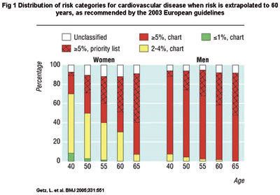 Jeg vil også gjerne kommentere diskusjonsbegrepet «risikanter.» Med det menes friske individer som har risikofaktorer for senere sykdom. Linn Getz og medarbeidere publiserte i 2005 i BMJ sin studie der de påviste at i Nord-Trøndelag stiger andelen innbyggere som har økt kardiovaskulær risiko kraftig med økende alder (1). Gruppen med høy risiko («high risk»; mer enn 5 % sannsynlighet for kardiovaskulær død innen ti år) utgjør i de høyere aldersgrupper en overveldende del av befolkningen (se faksimile). Forfattergruppen kan vanskelig tenke seg å medisinere så mange. Det blir da heller ikke gjort. Ifølge landets grossistbaserte legemiddelstatistikk får, omregnet i kontinuerlig bruk, ikke mer enn 13 % av befolkningen kolesterolsenkende statiner. Nøyaktige tall for andel medisinerte på de forskjellige alderstrinnene kan man om en tid få gjennom det nyopprettede reseptbaserte legemiddelregisteret.