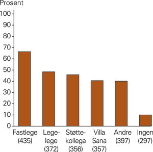 Vi stilte spørsmålet: «Hvis du trenger profesjonell hjelp for personlige problemer – hvem vil du kontakte?» Svaralternativene var Ingen, Fastlege, Lege-lege, Støttekollega, Villa Sana og Andre, og med mulighet til å krysse av på flere alternativer. Om lag halvparten av legene svarte ikke på dette spørsmålet. Fordelingen av svarene fremgår av figur 1.