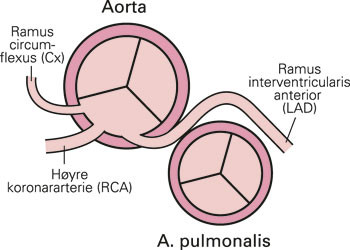 I hjertet (320 g, forventet ca. 300 – 350 g) var det ingen tegn til misdannelser i klaffene eller anomal avgang av aorta eller a. pulmonalis. I høyre sinus valsalvae var det tre ostier – med avgang av høyre koronararterie, ramus interventricularis anterior (LAD) og en relativt tynnkalibret ramus circumflexus. LAD løp mellom aorta og a. pulmonalis (fig 1). Til sammenlikning vises normalanatomien i figur 2. Avgangen av LAD fra aorta var mulig skrått forløpende, men selve ostiet virket rundt, ikke splittformet. Det var ingen okklusjon av arteriene. I myokard ble det bemerket en svak avbleking i venstre fremre vegg.