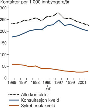 Figur 1 viser at konsultasjons- og sykebesøksraten på kveldstid (kl 16 – 23) steg hvert år fra 1989 til 1997. 1997 – 2002 var det en jevn nedgang. I 2000 var den årlige raten 227 konsultasjoner/sykebesøk per 1 000 innbyggere. Det var lavere enn raten på 233/1 000 for året 1989 og langt lavere enn 279/1 000 i toppåret 1997.