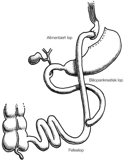 Biliopankreatisk avledning med duodenal omkobling (switch) (heretter omtalt som duodenal omkobling) er en primært malabsorptiv prosedyre. Inngrepet er en videreutvikling av biliopankreatisk avledning og man unngår problemene som blindsløyfer (blind loop) medførte ved jejunoileal bypass (10). Malabsorpsjon av fett og stivelse er mer uttalt enn ved gastrisk bypass og bestemmes av lengden av fellesløp for føde og fordøyelsessafter (fig 2). I Norge benyttes vanligvis en lengde på 75 – 100 cm; kortere fellesløp gir høyere vekttap, men øker faren for underernæring (15).