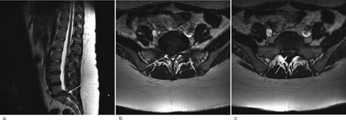 Klinisk hadde vår pasient utfall som ved cauda equina-syndrom. Med dette menes som regel en tilstand som skyldes skiveprolaps med affeksjon av sakrale nerverøtter, men andre romoppfyllende prosesser, som tumor eller blødning, kan gi tilsvarende symptomer og funn. Myelitt med affeksjon av conus er også en differensialdiagnose. Smerten er som regel betydelig ved store prolapser med nerverotaffeksjon. Vår pasient hadde ikke på noe tidspunkt i forløpet hatt smerter, verken utstrålende eller i korsryggen. Det var imidlertid tydelige sensoriske utfall og en sannsynlig sensorisk blæreparalyse.