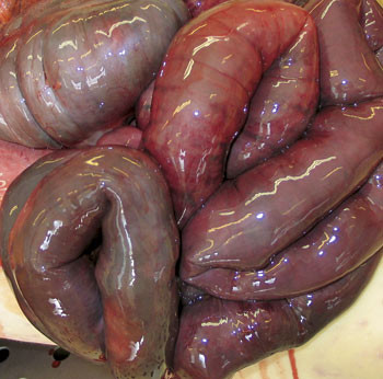 Obduksjon viste blødning i hele tynn- og tykktarm samt svart, gangrenøs tarm (fig 1). Det ble sett partiell aortadisseksjon fra proksimalt i aortabuen til a. iliaca communis. Flere steder var det blodkoagler i disseksjonsspalten. I aortabuen ble det funnet et blodkoagel utenfor adventitia, men ingen blødning i thorax eller abdomen. Det var ingen ruptur av intima eller adventitia makroskopisk. Det ble også påvist disseksjon i truncus coeliacus og i a. mesenterica inferior, samt tromber diffust i tarmkrøset. Hjertet var betydelig forstørret med konsentrisk hypertrofi og veide 640 g. Ved histologisk undersøkelse ble det påvist disseksjon i ytre tredel av tunica media i aorta, og mellom media og adventitia i truncus coeliacus og i a. mesenterica inferior. Truncus coeliacus og a. mesenterica superior hadde trombemasser i bred disseksjonsspalte med kompresjon av lumen (fig 2). Det var lett, uspesifikk inflammasjon i samme grensesjikt i de muskulære arterier. I aorta var det funn forenlig med lett mediadegenerasjon eller (mindre passende kalt) cystisk media nekrose.
