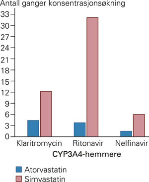 I tre av studiene ble atorvastatin og simvastatin undersøkt i samme forsøkspopulasjon med samme CYP3A4-hemmer, hemmerdosering og studiedesign, noe som styrker sammenlikningen av atorvastatins og simvastatins følsomhet overfor CYP3A4-hemmere. I figur 1 er forskjellene i interaksjonsgrad i disse studiene illustrert. Sammen med klaritromycin og ritonavir økte den aktive syreformen av simvastatin henholdsvis tre og åtte ganger mer enn syreformen av atorvastatin (13, 17). I studien med nelfinavir økte summen av syreformen og de aktive metabolittene tre til fire ganger mer for simvastatin enn for atorvastatin (16).