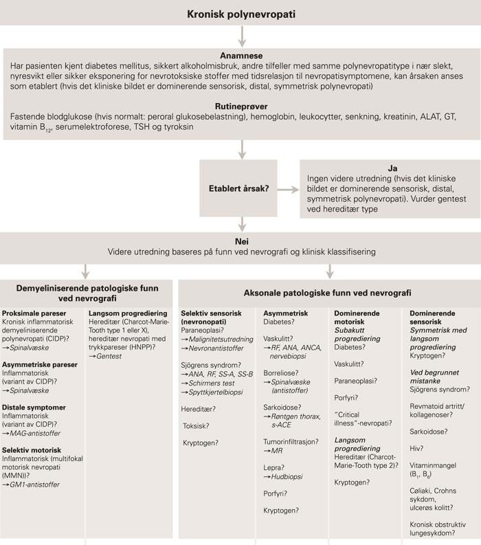 Klinisk praksis ved utredning av polynevropati synes å variere, og det tas både for mange og for få prøver (5, 6). Årsaken er trolig at det kreves en viss erfaring med nevromuskulære sykdommer for å kunne nyttiggjøre seg algoritmene i en travel hverdag. Denne oversiktsartikkelen er ment å gi leger uten nevromuskulær spesialkompetanse en praktisk veiledning i utredning og diagnostikk av kronisk polynevropati.