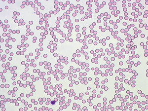 Barnet ble innlagt på ny én uke etter utskrivning med moderat anemi og mild trombocytopeni. Hun mottok blodtransfusjon og det ble rask bedring. Hun hadde normal vekst og psykomotorisk utvikling i månedene fremover. Ni måneder gammel ble jenta brakt til sykehus igjen etter to dager med nesetetthet og febrilia. Ved innleggelse fant man multiple petekkier og icterus. Allmenntilstanden var god. Hun hadde en uttalt trombocytopeni og hemolytisk anemi med redusert hemoglobin, redusert haptoglobin, elevert laktatdehydrogenase, elevert bilirubin, retikulocytose og mikrohematuri. Blodutstryk viste en del kjerneholdige røde blodceller, erytroblaster og schistocytter (fig 1, fig 2) samt god variabilitet med hensyn til lymfocytter og nøytrofile granulocytter. Direkte og indirekte Coombs prøve var negativ. Både direkte og indirekte trombotest var negativ. Det kunne ikke påvises antistoffer mot erytrocytter og trombocytter, og alle immunologiske prøver var negative. Jenta fikk infusjoner med normalt, humant immunglobulin og hun ble bektraktelig bedre i løpet av en uke. Seks uker etter utskrivning utviklet jenta i forbindelse med en streptokokkfaryngitt igjen trombocytopeni, men ingen behandlingsintervensjon var nødvendig. Blodprøver de påfølgende månedene viste hele tiden en moderat trombocytopeni. 17 måneder gammel fikk hun vannkopper og utviklet en alvorlig trombocytopeni som ble behandlet med ferskfrosset plasma (Octaplas).