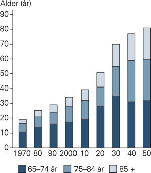 Andelen eldre i befolkningen øker kraftig, både i industrialiserte land og i utviklingsland. Forventet gjennomsnittlig levetid for menn og kvinner i Norge har steget fra henholdsvis 72 år og 79 år i 1980 til 78 år og 82 år i dag. En 80-årig mann eller kvinne har i gjennomsnitt henholdsvis sju og ni år igjen å leve (1). Av mennesker på 65 år og eldre vil gruppen over 85 år vokse sterkest i fremtiden (fig 1). Fordi flesteparten av de eldste ikke oppnår sin høye levealder fordi de er sprekest, men fordi de i stadig større grad overlever til tross for og med sine kroniske lidelser (2), vil også deres behov for fremtidige helsetjenester bli større. Den medisinske utviklingen har ført til at stadig flere kan få effektiv hjelp for sine helseplager i høy alder (3). Utvalgte gamle pasienter tåler planlagte større kirurgiske inngrep med bra resultat på kort og på lengre sikt. Dette er blant annet dokumentert for hjertekirurgi (4).